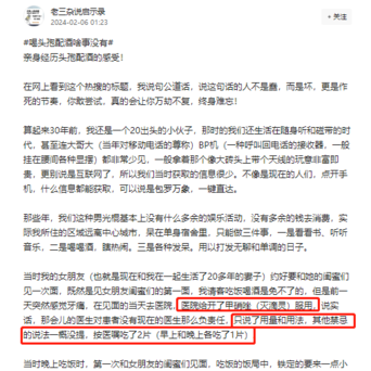 【网友亲历“头孢配酒”:眼球充血,脸色苍白,如同僵尸面孔】看到#喝头孢配酒啥事没有#这个热搜的标题,网友出来用30年前的亲身经历说句公道话,不要去做一些无知者无畏的蠢事:聚会前一天感觉牙痛,医院给开了甲硝唑(灭滴灵)服用,只说了用量和用法,其他禁忌的说法一概没提,按医嘱吃了2片(早上和晚上各吃了1片)。