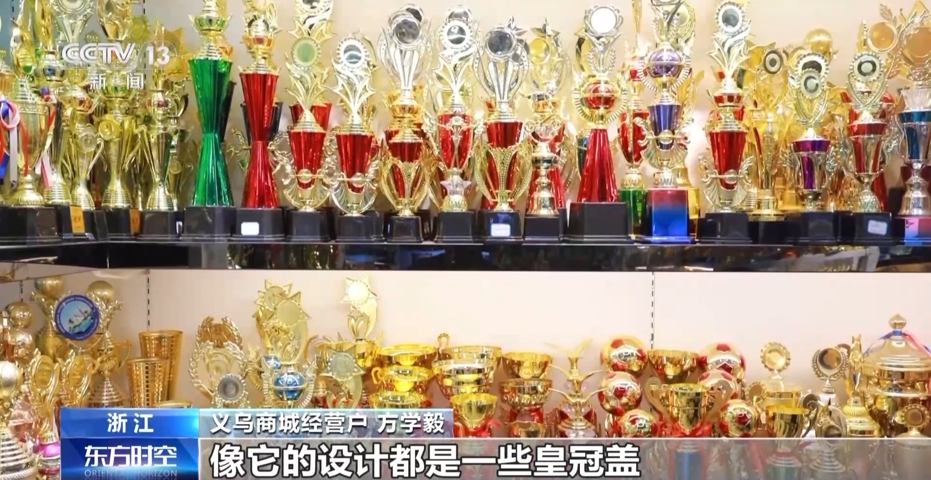 义乌商城经营户 方学毅:像这些法国元素的金属奖杯,在欧洲那边非常热销,是我们最热销的款式,像它的设计都是一些皇冠盖,尺寸非常适合各种项目。